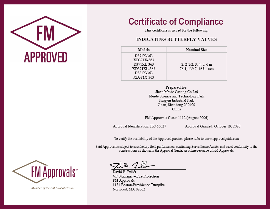 MEIDE GROUP obtains FM approval for Butterfly Valve with Normally Closed Tamper Switch(XD371XG, XD371XLG,XD381XG).