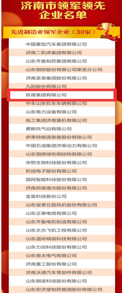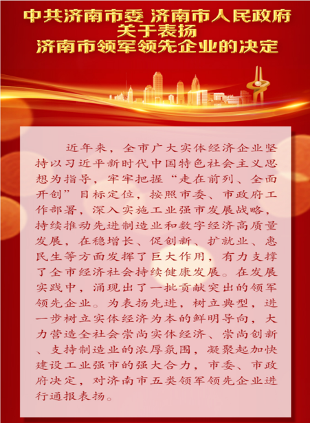 7月9號,中國共產黨濟南市委員會、濟南市人民政府發布關于表揚濟南市領軍領先企業的決定的文件。玫德集團榮獲先進制造業領軍企業。