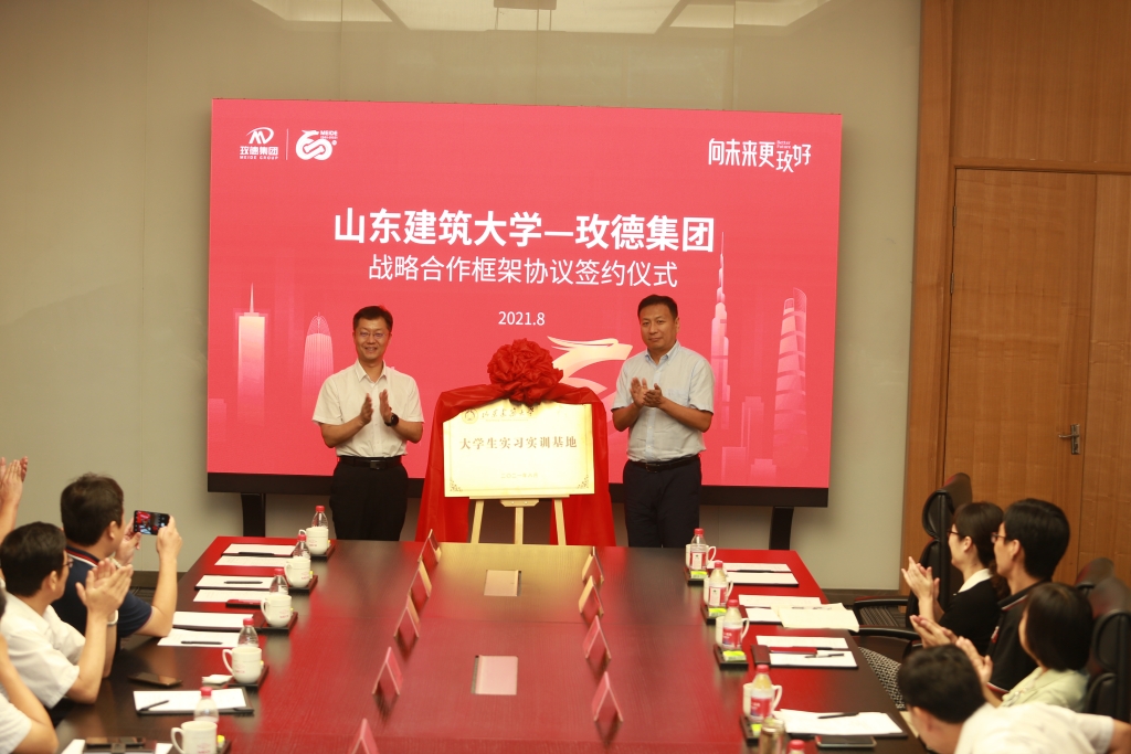 集團(tuán)董事局主席孔令磊與山東建筑大學(xué)校長(zhǎng)于德湖先后進(jìn)行致辭,雙方展望了校企合作的美好愿景,進(jìn)行了深入溝通交流。校企雙方簽訂了戰(zhàn)略合作框架協(xié)議,并為在玫德集團(tuán)設(shè)立的“山東建筑大學(xué)產(chǎn)教融合實(shí)踐基地”和“山東建筑大學(xué)大學(xué)生實(shí)習(xí)實(shí)訓(xùn)基地”揭牌。