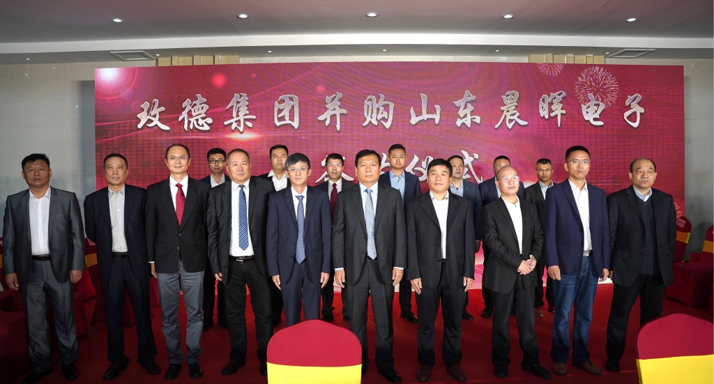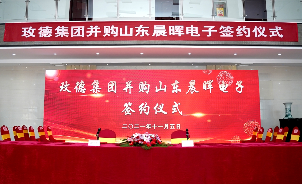 2021年11月5日,“玫德集團并購山東晨暉電子科技有限公司簽約儀式”在山東泰安隆重舉行,玫德集團董事局主席孔令磊先生、董事局副主席劉勇先生、亓曉玉先生、常城先生、胡文有先生,以及原山東晨暉電子科技有限公司董事長王學水先生,總經理張君昭先生等一眾高層出席。在現場嘉賓的共同見證下,玫德集團宣布并購山東晨暉電子科技有限公司。