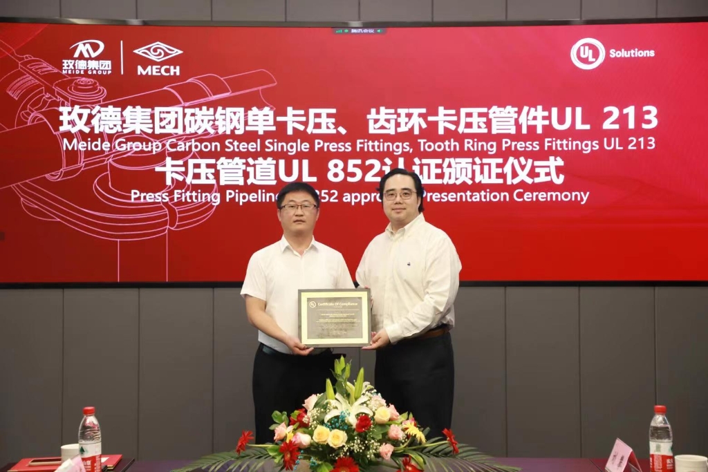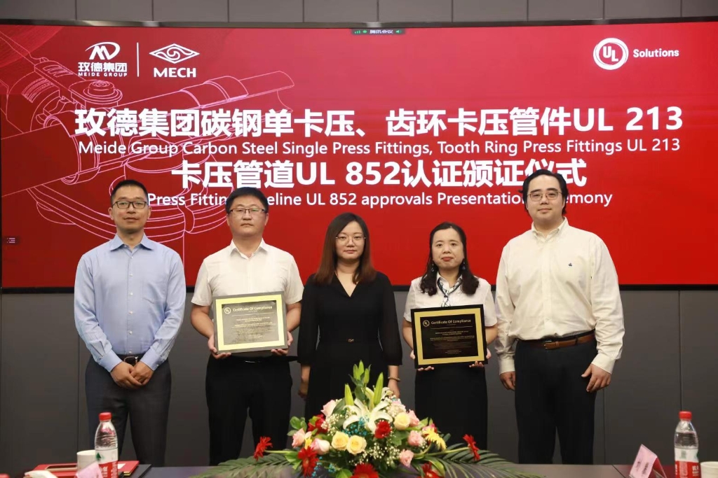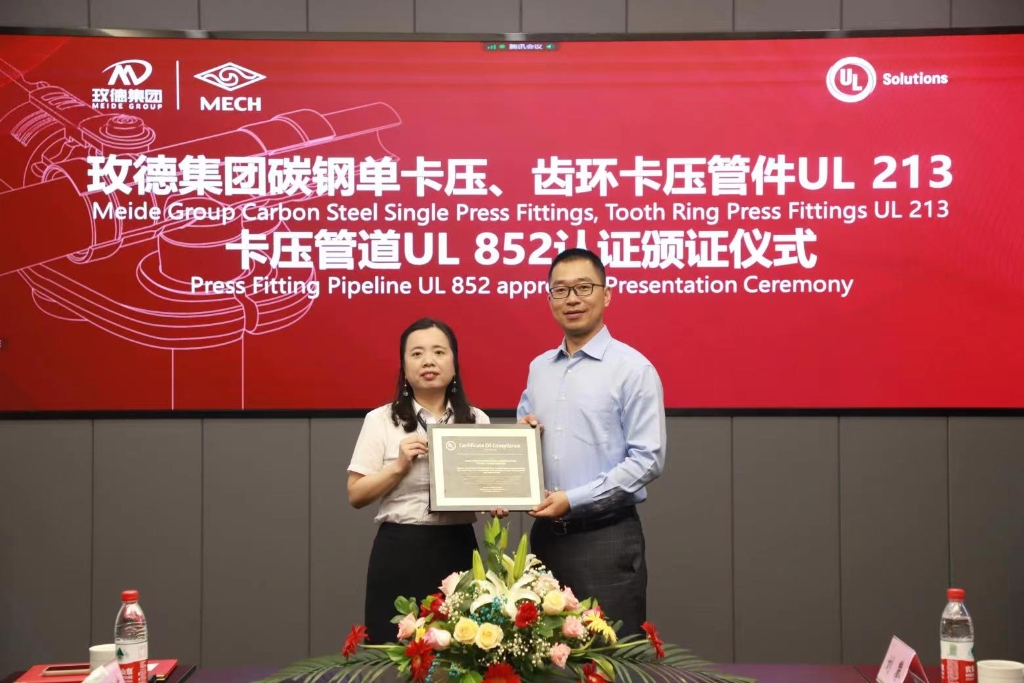 玫德雅昌(濟(jì)南)管業(yè)有限公司獲得國(guó)內(nèi)首張卡壓管件UL 213標(biāo)準(zhǔn)和卡壓管道UL 852標(biāo)準(zhǔn)認(rèn)證證書,7月15日,由UL Solutions為玫德雅昌頒發(fā)認(rèn)證證書。UL Solutions建筑環(huán)境事業(yè)部亞洲區(qū)運(yùn)營(yíng)總監(jiān)許潔,中國(guó)大陸及港澳地區(qū)銷售經(jīng)理李景云,高級(jí)客戶經(jīng)理羌金玉,玫德集團(tuán)董事局副主席亓?xí)杂瘢档卵挪?jì)南)管業(yè)有限公司總經(jīng)理田洪蓮、副總經(jīng)理劉攀雙方管理層領(lǐng)導(dǎo),以及來自馬來西亞、菲律賓、新加坡、香港、臺(tái)灣等國(guó)內(nèi)外100多家客戶現(xiàn)場(chǎng)和視頻參加了頒證儀式。