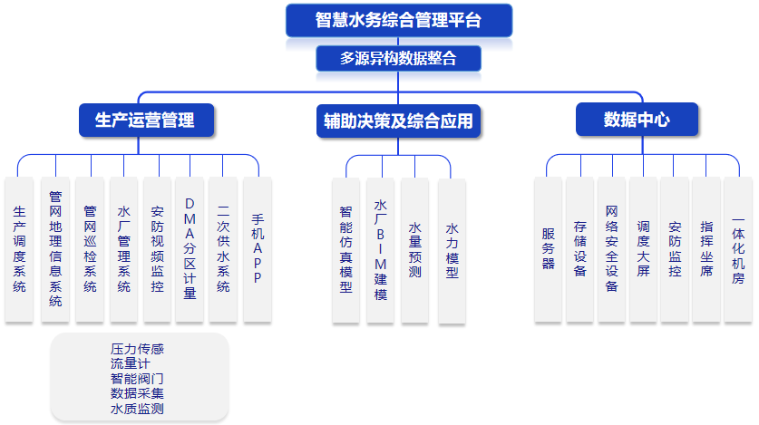 從水源地,到水廠、管網、泵站,通過軟、硬結合,將數據監控覆蓋整個生產運營工序。同時運用大數據算法模型,分析數據特性,發揮數據價值,輔助監管與決策。在建設初期,通盤考慮數據中心建設,將結構化及非結構化數據進行原始存檔和安全備份,對治理后的數據進行BI呈現,構建智能調度中心。