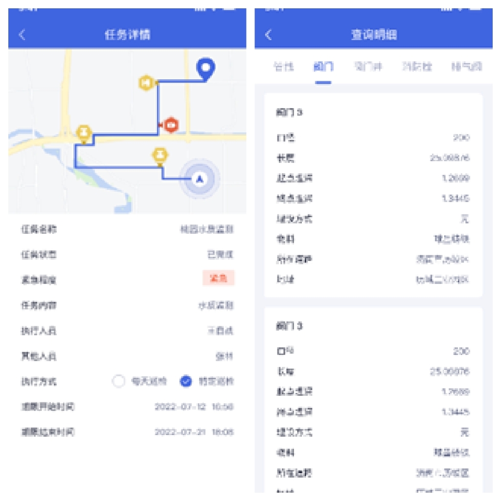 通過GIS技術(shù)在移動(dòng)端的應(yīng)用,供水APP能在巡檢路線上顯示系統(tǒng)中已經(jīng)錄入的設(shè)備,點(diǎn)擊設(shè)備圖標(biāo)可顯示設(shè)備的基本信息及未處理完成的缺陷工單和維修工單等,巡檢人員依據(jù)在移動(dòng)端接收到的巡檢計(jì)劃,通過任務(wù)獲取、巡檢提示、移動(dòng)端動(dòng)態(tài)記錄與實(shí)時(shí)反饋等功能,極大地提高了設(shè)備的巡檢效率,確保了設(shè)備的完好率、準(zhǔn)確率,同時(shí)巡檢人員能實(shí)時(shí)掌握管線走向、材質(zhì)、口徑、維修等數(shù)據(jù),克服了原先由于管線資料不全、部分區(qū)域存在巡檢盲區(qū)的不足,提升了查找漏點(diǎn)的準(zhǔn)確率。供水APP實(shí)現(xiàn)了區(qū)域、位置、設(shè)備等模型與數(shù)字化信息的實(shí)時(shí)互動(dòng),提高了巡檢人員執(zhí)行任務(wù)的工作效率。