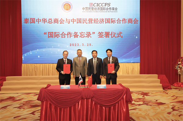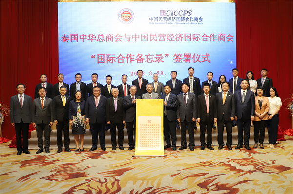 3月28日下午,考察團一行拜訪了泰國中華總商會,中國駐泰大使館商務公參王立平、泰國中華總商會副主席何克家、泰國中華總商會副秘書長蕭漢銘、歐先梓先生以及商會其他領導一起出席交流活動,孔主席代表考察團發表致辭,并參與了泰國中華總商會與中國民營經濟國際合作商會“國際合作備忘錄”簽署儀式,雙方互贈禮物并合影留念。