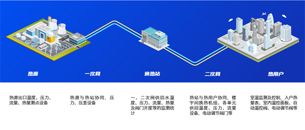 打通城市供熱“源-網-站-戶”全流程,實現熱網互聯互感,精確采集供熱系統數據, 通過不同算法組合優化,提升供熱系統監管能力,為統一調控打好基礎,形成全鏈路、軟硬一體化、閉環的智慧供熱整體解決方案。