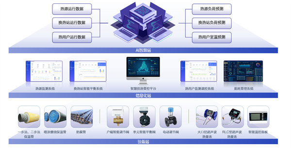 智慧供熱平臺包含三層架構:AI智慧層、信息化層、硬件設備層。