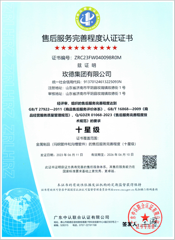 近日,玫德集團(tuán)有限公司通過了國家標(biāo)準(zhǔn)GB/T 27922-2011《商品售后服務(wù)評價體系》、GB/T 16868-2009《商品經(jīng)營服務(wù)質(zhì)量管理規(guī)范》、Q/GDZR 01068-2023《售后服務(wù)完善程度技術(shù)規(guī)范》認(rèn)定的“十星級”售后服務(wù)完善程度認(rèn)證證書,這是對玫德多年來堅持“以用戶為中心”的核心價值觀、不斷完善售后服務(wù)體系的高度認(rèn)可。