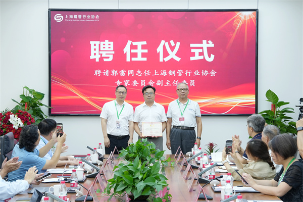 聘請郭雷同志任上海鋼管行業協會專家委員會副主任委員,上海鋼管行業協會專家委員會主任孫永喜、上海鋼管行業協會物裝委員會主任林光輝共同為玫德集團董事局副主席、邁科管業董事長郭雷頒發上海鋼管行業協會專家委副主任證書。