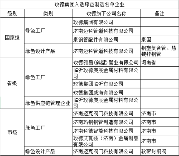 7月28日,山東省工業和信息化廳公布了2023年(第一批)省級綠色制造名單。玫德集團3家企業入選,其中玫德集團威海有限公司、玫德集團臨沂有限公司被評為為山東省綠色工廠,臨沂玫德庚辰金屬材料有限公司被評為山東省綠色供應鏈管理企業。