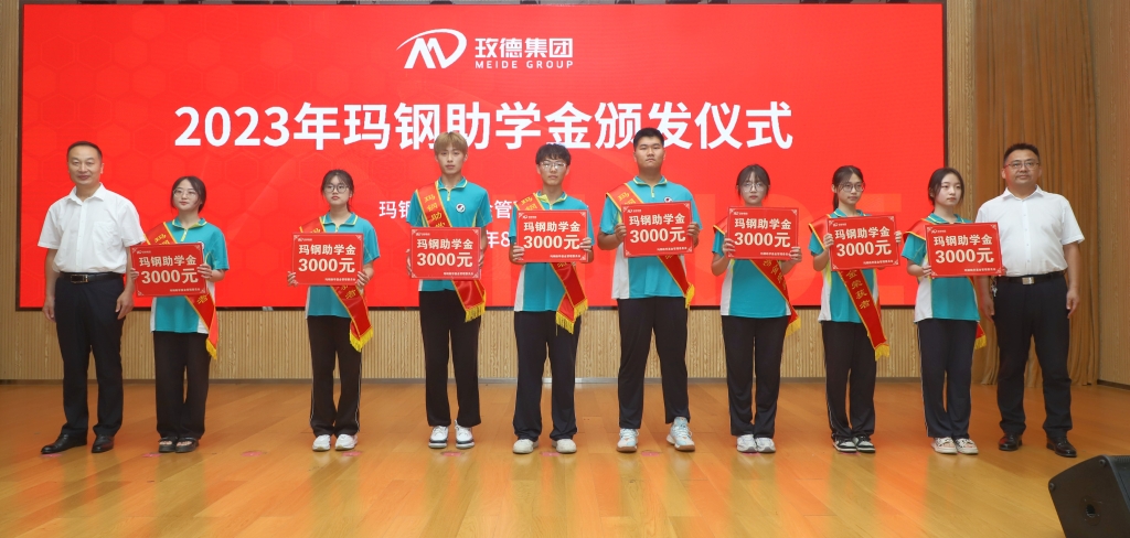8月15日上午,2023年瑪鋼助學金頒發儀式在玫德集團科技園隆重舉行。171名優秀高三畢業生榮獲共計72.1萬元瑪鋼助學金,90名高三年級優秀任課教師榮獲31.92萬元瑪鋼助學金。玫德集團為7名員工子女發放特別助學獎勵1.8萬元。