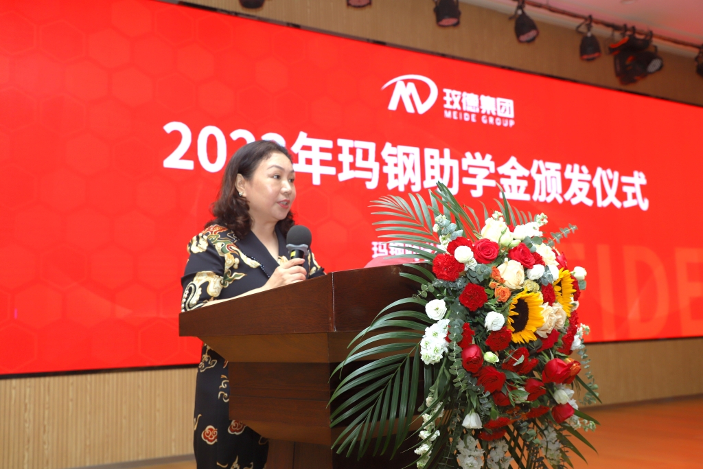 瑪鋼助學基金管理委員會會長劉勇、玫德集團有限公司工會副主席丁娟向玫德員工子女頒發了特別助學金。