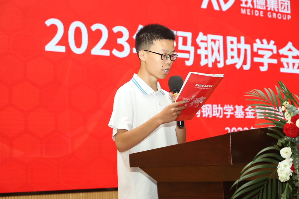 被武漢大學錄取的平陰一中學生代表郭懷遠同學做了精彩發言,他表示玫德設立獎學金催人奮進、建造公益設施惠及人民,凡此種種無不體現了無私奉獻、心系人民、天下為公的玫德大愛。他代表全體同學發出倡議,以實際行動,絕不辜負家鄉培養、玫德大愛!