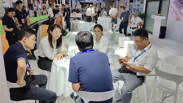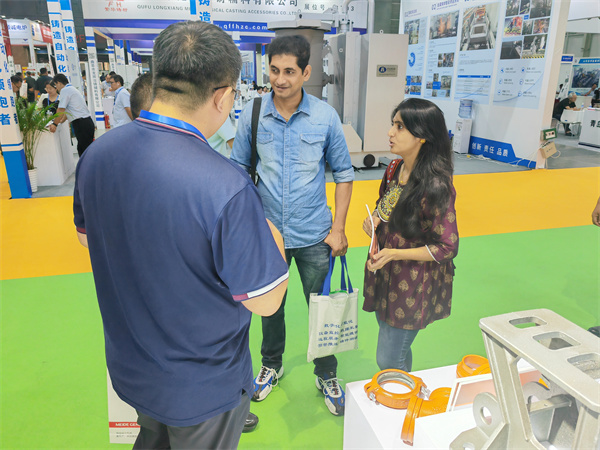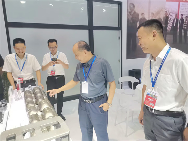 玫德集團董事局副主席李傳軍,濟南科德智能科技有限公司總裁劉少云,玫德庚辰金屬材料有限公司總裁張志義,濟南科德智能科技有限公司高級副總裁張明一、劉璐在展會現場指導工作并與客戶深入交流。