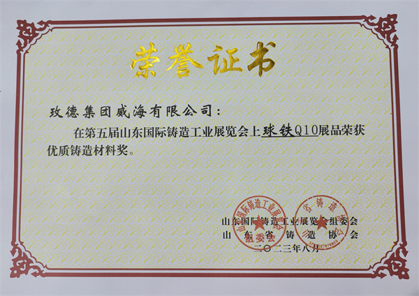 4. 玫德集團威海有限公司展品“球鐵 Q10”榮獲“優質鑄造材料獎”。