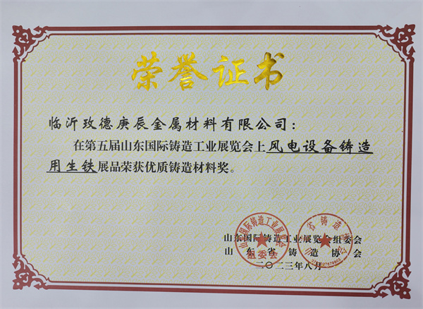 3. 臨沂玫德庚辰金屬材料有限公司展品“風電設備鑄造用生鐵”榮獲“優質鑄造材料獎”。