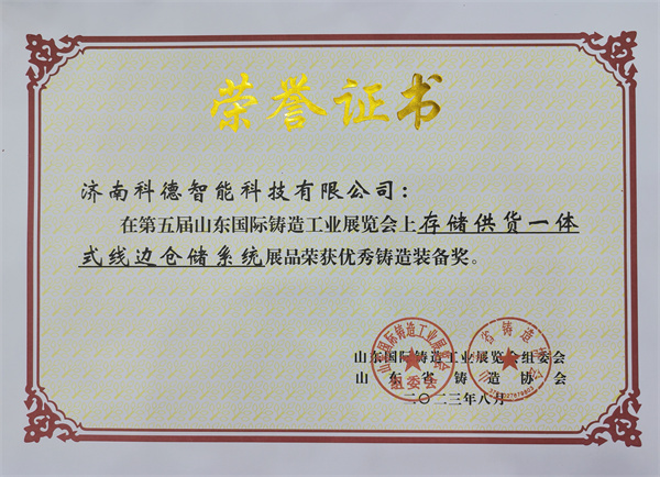 2.濟南科德智能科技有限公司展品“存儲供貨一體式線邊倉儲系統”榮獲“優秀鑄造裝備獎”。