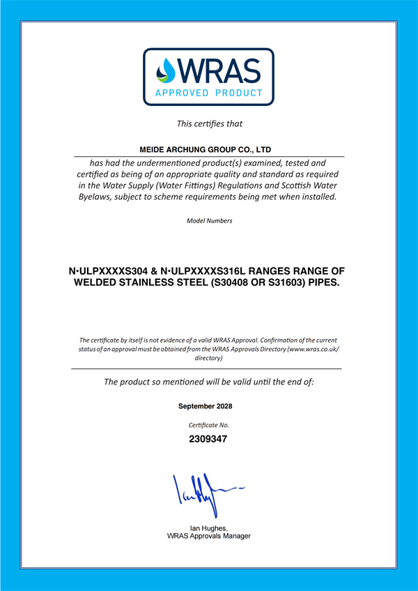 玫德雅昌一直朝著國際高標準而不懈努力,始終堅持完善產品的相關質量認證。本次WRAS認證將進一步滿足客戶應用需求,并獲得不同行業客戶的信任和認可。不銹鋼管材管件作為流體輸送的關鍵配件,符合WRAS認證不僅證明它的合規性,也是采購商避免選到低質量或缺陷產品的最簡單和最可靠的方式。