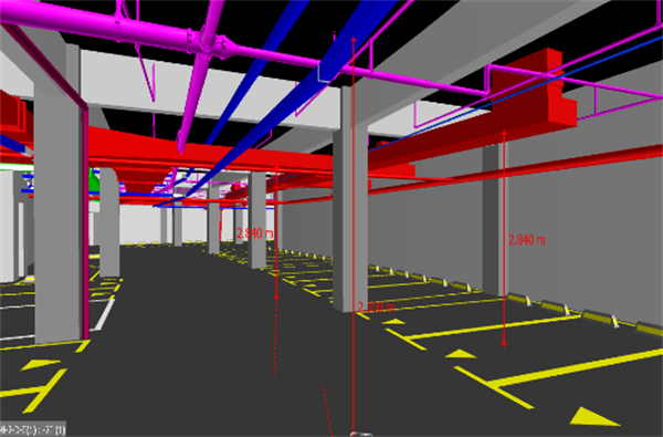 利用BIM模型,提前檢查各區域的凈空高度,進行確認,對不符合規范及有特殊要求的區域進行調整,減少后期安裝過程中的拆改,降低工程成本,滿足客戶的使用要求。