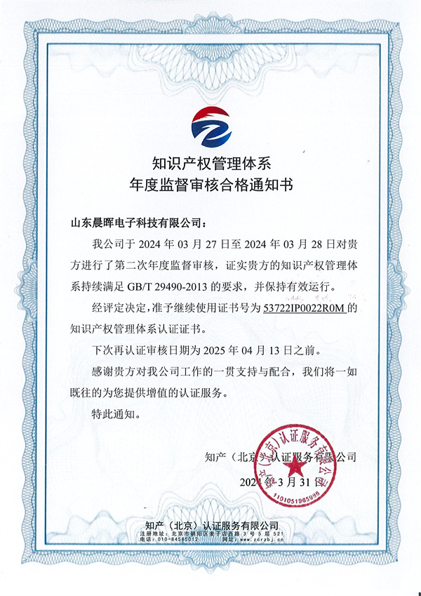 2024年3月31日,玫德集團旗下山東晨暉電子科技有限公司順利通過了知識產權管理體系年度監督審核。這一認證標志著山東晨暉在知識產權管理方面邁出了堅實的一步,進一步在行業內樹立了權威和信譽。