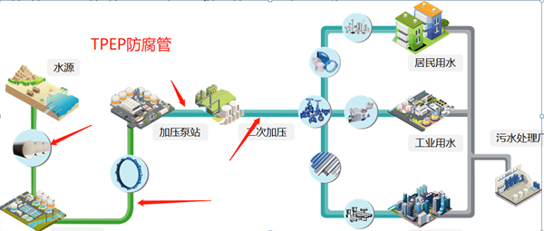 TPEP 防腐鋼管主要應用于水源→水廠→加壓泵站→二次加壓這幾個階段,大口徑 TPEP 管輸送流量大,提高了階段輸水的效率,保障了居民、工業等用戶用水需求;同時,TPEP 防腐鋼管的抗溫、耐磨、耐沖擊等性能優越,滿足多種場景下的使用要求,管道內壁采用環氧粉末,保證了用戶用水衛生安全!