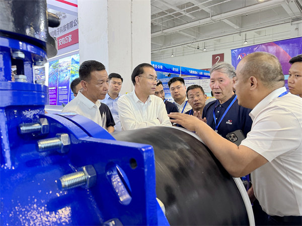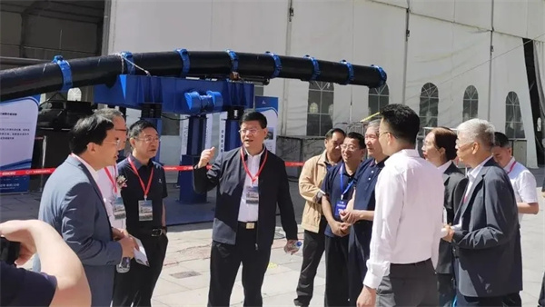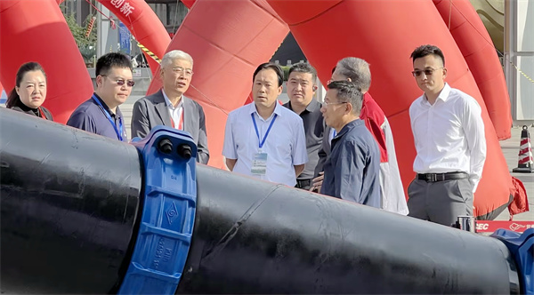 甘肅省水利廳廳長牛軍,甘肅省水利廳一級巡視員、省水利學(xué)會理事長吳天臨,甘肅省水利水電勘測設(shè)計研究院有限責(zé)任公司水利工程正高級工程師張東等蒞臨玫德集團(tuán)展位參觀指導(dǎo)。參觀到大口徑鋼管柔性連接技術(shù)時,牛軍廳長講此技術(shù)解決了管道的很大難題,具有非常廣闊的應(yīng)用前景。