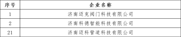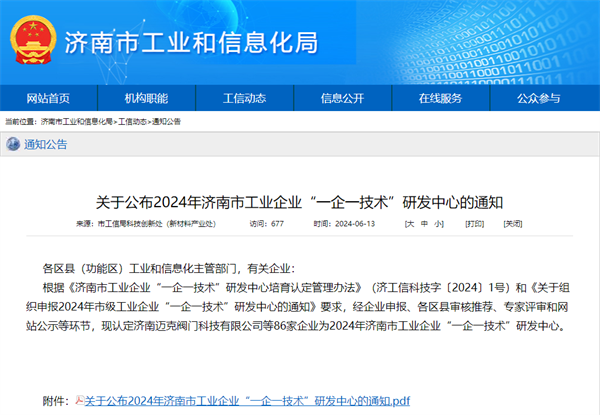 2024年6月13日,濟南市工信局發布了《關于公布2024年濟南市工業企業“一企一技術”研發中心的通知》。其中,玫德集團旗下濟南邁科管道科技有限公司、濟南邁克閥門科技有限公司、濟南科德智能科技有限公司均順利通過2024年濟南市工業企業“一企一技術”研發中心認定。