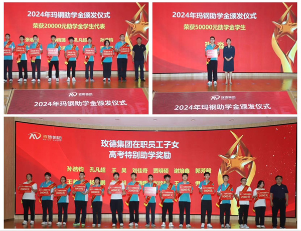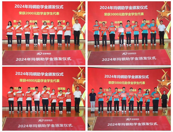 根據《瑪鋼助學基金管理章程》,183名畢業生榮獲瑪鋼助學金,獎勵金額74.6萬;104名教師榮獲瑪鋼助學金,獎勵金額32.29萬。玫德集團14名員工的子女獲得特別助學金獎勵,金額9.7萬。