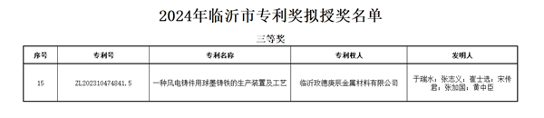 近日,臨沂市市場監(jiān)督管理局發(fā)布《2024年度臨沂市專利獎擬授獎項目公示》信息,臨沂玫德庚辰金屬材料有限公司的專利項目“一種風電鑄件用球墨鑄鐵的生產(chǎn)裝置及工藝”榮獲臨沂市專利獎三等獎。這一榮譽不僅是對玫德庚辰在技術(shù)創(chuàng)新領(lǐng)域上的肯定,也是對公司研發(fā)實力和創(chuàng)新能力的高度認可。