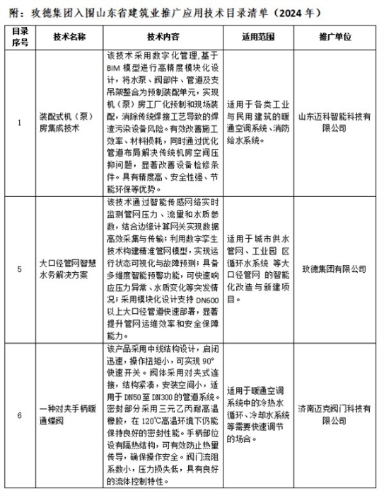 近日,山東省住房和城鄉建設廳發布了《山東省建筑業推廣應用技術目錄(2024年度)》, 玫德集團旗下玫德集團有限公司、濟南邁克閥門科技有限公司、山東邁科智能科技有限公司各有1項成果入選;其中《大口徑管網智慧水務解決方案》成為山東省住建廳重點選取的有引領性、示范性和產業帶動作用的標志性成果之一。此次征集聚焦居住品質提升、綠色低碳等重點領域,涵蓋新技術、新材料、新工藝、新產品,全省共遴選出36項成果。