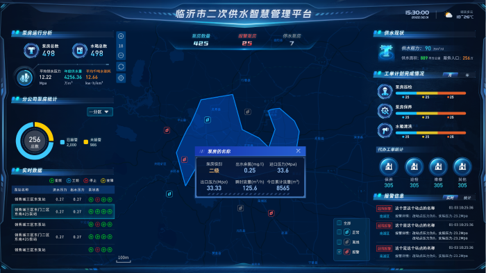 平臺看板集中展示水廠與泵房位置及運行狀態,實時監控壓力、流量、水質等20余項指標,支持按區域、時間、設備類型多維度查詢,各運行參數一目了然,直觀顯示設備異常位置與狀態,及時發現問題并解決。