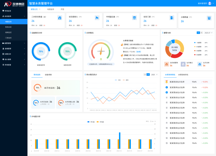 平臺自動采集并動態更新泵房數量、設備總量、服務用戶等基礎數據,實時計算設備在線率、水質合格率、能耗效率等關鍵運營指標。一鍵生成日/月/年運行分析報告,支持設備能效排名與對標。