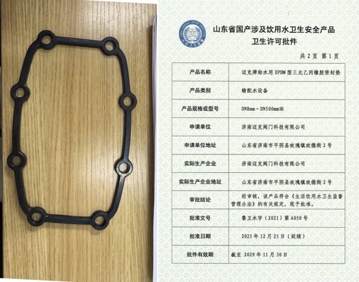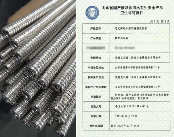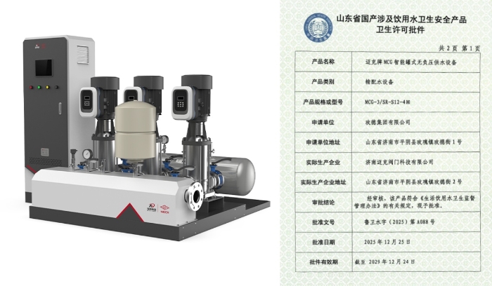 近日,玫德集團(tuán)旗下三類給水系列產(chǎn)品成功取得衛(wèi)生許可批件,標(biāo)志著集團(tuán)在民用及市政給水領(lǐng)域的合規(guī)性與安全性獲得權(quán)威認(rèn)可。本次獲批產(chǎn)品包括:玫德集團(tuán)有限公司生產(chǎn)的“邁克牌MCG智能罐式無負(fù)壓供水設(shè)備”、濟(jì)南邁克閥門科技有限公司生產(chǎn)的“邁克牌給水用EPDM型三元乙丙橡膠密封墊”以及玫德艾瓦茲(濟(jì)南)金屬制品有限公司生產(chǎn)的“邁克牌給水用不銹鋼波紋管”。